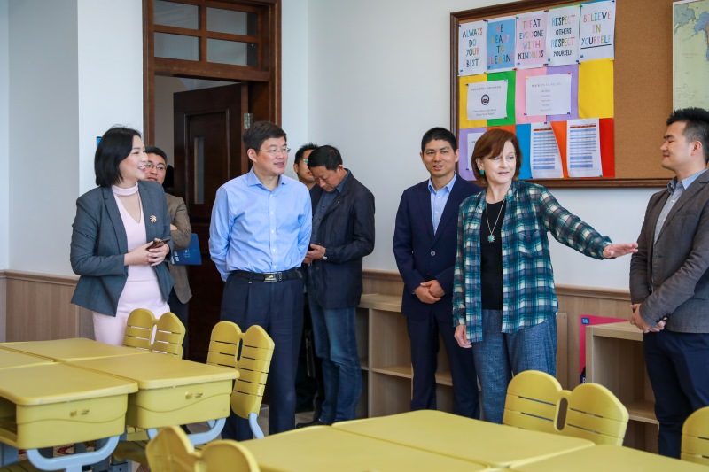 市領導一行參觀了幼兒園、小學、初中及美國高中的樣板教室,對校園環境贊不絕口,肯定了學校的國際化定位。謝軍副秘書長仔細詢問了校區建設情況、以及各教室的教具、家具配置標準,以及材料安全等情況,并給予了高度評價。