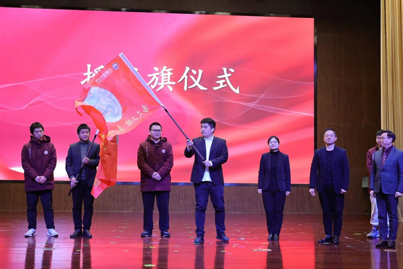 秦新春總校長和尹漸平校長為高三師生授旗,班主任和班長依次接過戰旗。百日拼搏,戰旗銘志;百日奮進,旗開得勝。